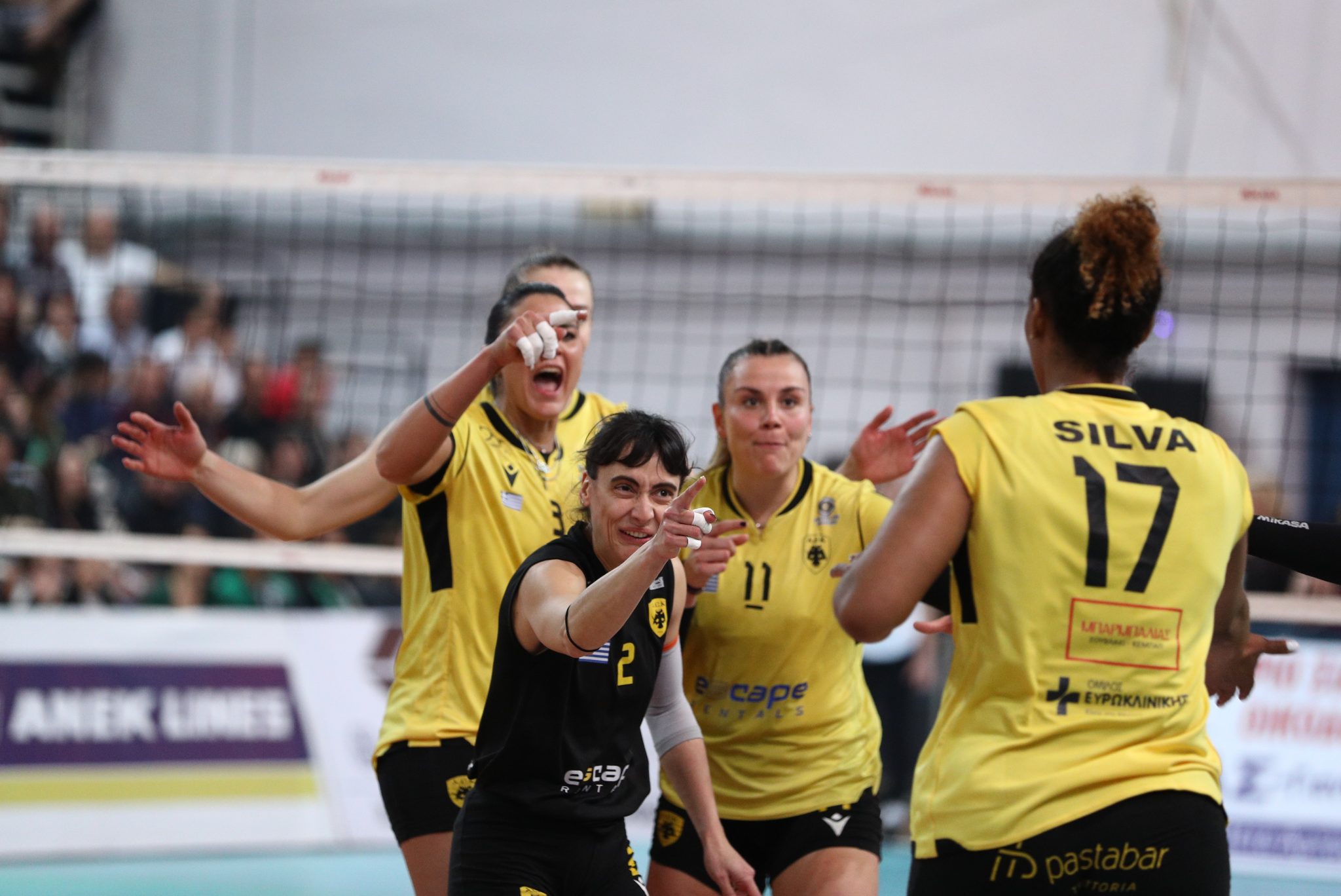 Το ντέρμπι συνεχίστηκε και στο τέταρτο, με τις αθλήτριες της ΑΕΚ να βγάζουν περισσότερη ψυχή στα κρίσιμα σημεία και να κλείνουν το σετ και τον αγώνα με 25-20.