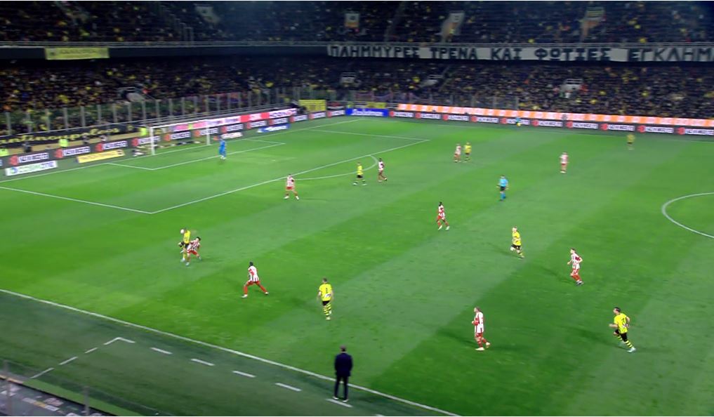 Ο Μεξικανός μέσος της Ένωσης κοντρόλαρε την μπάλα με το χέρι πριν αποφύγει το μαρκάρισμα του Χουάνγκ και μπει στην περιοχή των πειραιωτών.