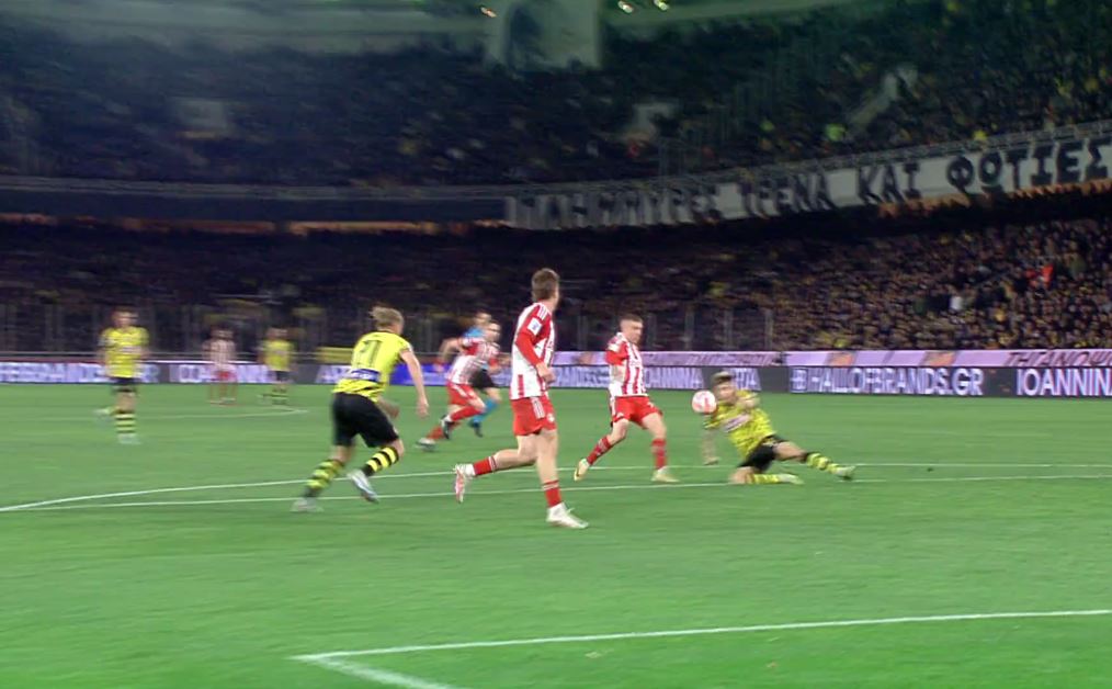 Ο Ιταλός διαιτητής τα έκανε θάλασσα και σε αυτή την φάση καθώς δεν καταλόγισε το πέναλτι υπέρ του Ολυμπιακού.
