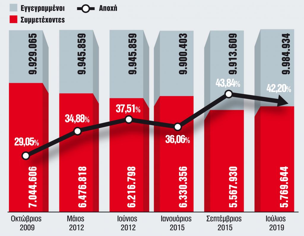 Ισως η πιο τρανταχτή περίπτωση ήταν η τεράστια πτώση στη συμμετοχή από το 2009 έως το 2012. Η απογοήτευση των ψηφοφόρων ήταν τόσο δυνατή και τόσο συσσωρευμένη που καθόρισε όχι μόνο το αποτέλεσμα των καλπών εκείνου του Μαΐου, αλλά και το μέγεθος του εκλογικού σώματος που συμμετείχε στη διαδικασία – μέσα στα τρία πιο ταραγμένα χρόνια της Μεταπολίτευσης, χάθηκαν πάνω από 550.000 ψηφοφόροι. Πώς ερμηνεύεται η αποχή εκείνης της περιόδου; Από την απαξίωση στο δικομματικό σύστημα που εναλλασσόταν ως τότε στην εξουσία, εξού και οι δύο κερδισμένοι ήταν ο αντισυστημικής λογικής ΣΥΡΙΖΑ, ο οποίος εκτόξευσε τα ποσοστά του, και η νεοναζιστική Χρυσή Αυγή, που ξεπέρασε για πρώτη φορά το 3%. Το νέο τοπίο επιβεβαιώθηκε έναν μήνα αργότερα, «χτίζοντας» το βασικό πολιτικό δίπολο της επόμενης δεκαετίας. Αντίστοιχη περίπτωση απογοήτευσης και μουδιάσματος παρατηρήθηκε στις εκλογές του Σεπτεμβρίου του 2015: με ψαλιδισμένες προσδοκίες και χωρίς αυταπάτες πια για τις αντιμνημονιακές εναλλακτικές που είχε και για το ποιοι θα τις υπηρετούσαν, οι πολίτες δεν έτρεξαν στα εκλογικά κέντρα – αντιθέτως, σε εκείνες τις εκλογές σημειώθηκε το υψηλότερο ποσοστό αποχής σε εθνικές εκλογές την τελευταία δεκαπενταετία.