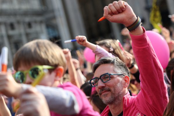 «Εσείς εξηγείτε στον γιο μου ότι δεν είμαι η μητέρα του», έγραφε μια πινακίδα που κρατήθηκε σε μια θάλασσα από σημαίες ουράνιου τόξου που γέμισε μια από τις κεντρικές πλατείες του Μιλάνου το Σάββατο.