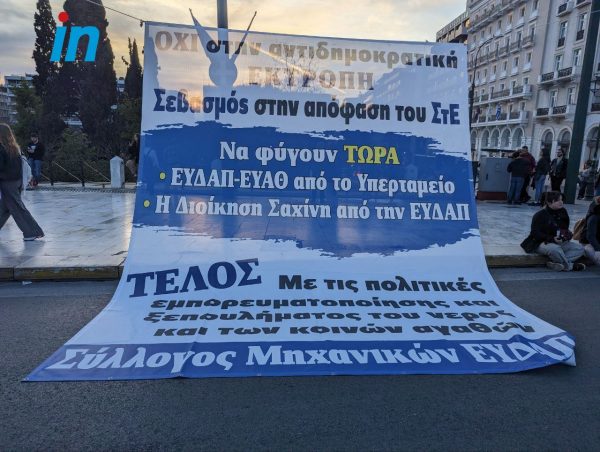 Πλήθος κόσμου συγκεντρώνεται στο Σύνταγμα για να δηλώσει την αντίθεσή του με την ιδιωτικοποίηση του νερού. Το in καταγράφει εικόνες, συνθήματα και τους φόβους των πολιτών που θεωρούν το νομοσχέδιο που ψηφίζεται προθάλαμο ιδιωτικοποίησης
