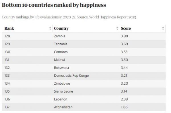Στο γενικό πίνακα της ευτυχίας η Φινλανδία παρέμεινε στην κορυφή για έκτη συνεχόμενη χρονιά και το Αφγανιστάν στο χαμηλότερο επίπεδο, μια θέση που κατείχε πριν από την επιστροφή των Ταλιμπάν το 2021. Είναι επίσης η τέταρτη συνεχόμενη χρονιά κατά την οποία το Ηνωμένο Βασίλειο πέφτει στο «δείκτη ευτυχίας». Η χώρα βρίσκεται στην 19η θέση, με τη Λιθουανία και την Τσεχία στο τοπ 15% των πιο ευτυχισμένων κρατών πριν από τη Γαλλία, αλλά πίσω από τη Γερμανία, τις ΗΠΑ, την Αυστραλία, την Ιρλανδία και όλες τις σκανδιναβικές χώρες.