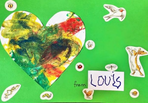 Και ο Louis, ο οποίος ήταν μόλις δύο ετών τότε, χρησιμοποίησε επίσης πράσινο χαρτί για την κάρτα του για τη Γιορτή της Μητέρας, η οποία περιείχε μια πολύχρωμη καρδιά που περιβαλλόταν από διάφορα ζώα – τα οποία είχαν κολληθεί πάνω στην κάρτα.