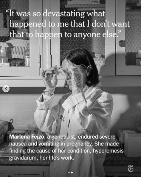Αφού υπέφερε από έντονη ναυτία και εμετό κατά τη διάρκεια της εγκυμοσύνης, η γενετίστρια Μαρλένα Φέιζο έκανε σκοπό της ζωής της να βρει την αιτία της πάθησής της, την υπερέμεση της κύησης.