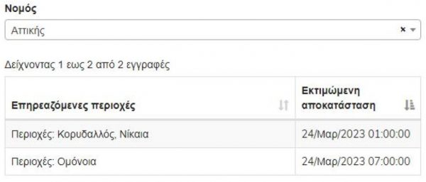 Σύμφωνα με τον ΔΕΔΔΗΕ, οι διακοπές ρεύματος θα κρατήσουν μέχρι και μετά τα μεσάνυχτα και συγκεκριμένα, στον Κορυδαλλό και τη Νίκαια, θα διαρκέσουν μέχρι τη 1 το ξημέρωμα της Παρασκευής ενώ στην Ομόνοια μέχρι τις 7 το πρωί.