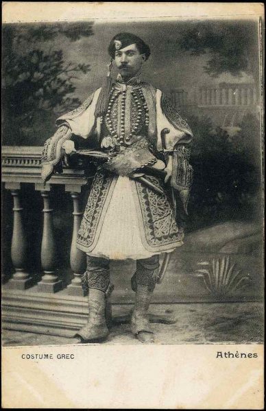 Ασπρόμαυρη φωτογραφία, ένας Έλληνας με φορεσιά φουστανέλα σε επιστολικό δελτάριο των αρχών του 20ου αι. / Photo: Public Domain