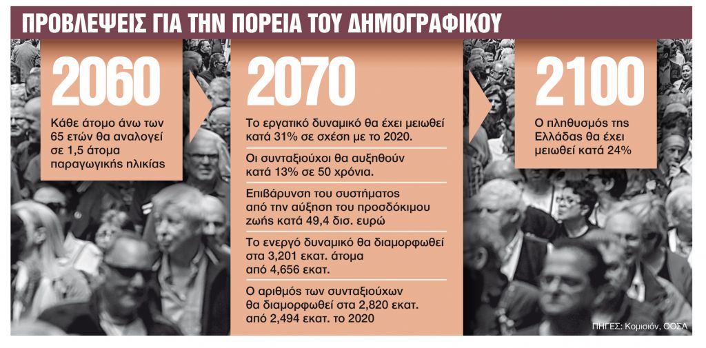 Βάσει των σημερινών δημογραφικών συνθηκών, εκτιμάται ότι το 2070 το εργατικό δυναμικό θα μειωθεί σε σχέση με το 2020 κατά 31%, ενώ οι συνταξιούχοι θα αυξηθούν κατά 13% σε σχέση με το 2020. Η γονιμότητα έχει πέσει πλέον σε αρνητικά επίπεδα αντικατάστασης γενεών. Σύμφωνα με τον ΟΟΣΑ, η Ελλάδα θα υποστεί πληθυσμιακή μείωση κατά 24% έως το 2100, ενώ οι μακροχρόνιες δημογραφικές τάσεις αναφέρουν πως κάθε άτομο άνω των 65 ετών αναλογεί σε περίπου 9,3 ή μόλις 1,5 άτομο παραγωγικής ηλικίας το 1960, το 2020 και το 2060.