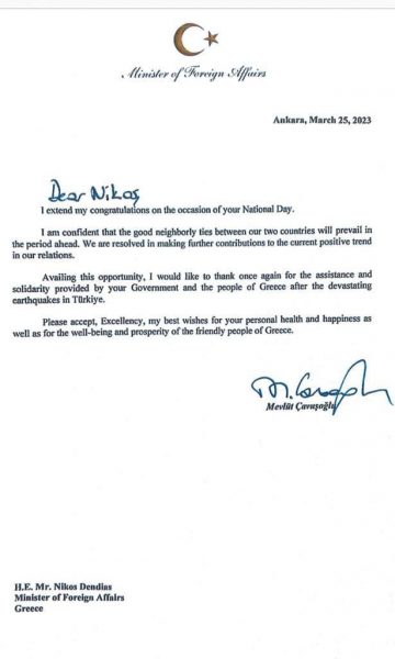 Αρχικά, ο υπουργός Εξωτερικών της Τουρκίας ευχήθηκε με επιστολή στον ομόλογό του, Νίκο Δένδια, ενώ εξέφρασε τη βεβαιότητά του ότι οι σχέσεις καλής γειτονίας, οι οποίες υφίστανται αυτή τη στιγμή μεταξύ Ελλάδας και Τουρκίας, θα παγιωθούν στο μέλλον.