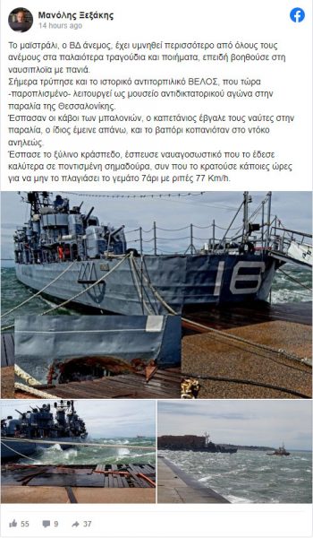 Σήμερα τρύπησε και το ιστορικό αντιτορπιλικό ΒΕΛΟΣ, που τώρα -παροπλισμένο- λειτουργεί ως μουσείο αντιδικτατορικού αγώνα στην παραλία της Θεσσαλονίκης.