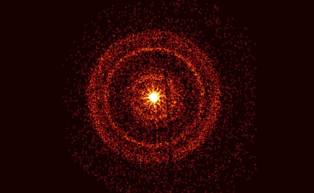Ομόκεντροι κύκλοι που εμφανίστηκαν στο Διάστημα όταν οι πίδακες ακτινοβολίας διέγειραν σωματίδια σκόνης. Οι γραμμές αντιστοιχούν σε κενά μεταξύ ανιχνευτών (ESA/XMM-Newton/M. Rigoselli)