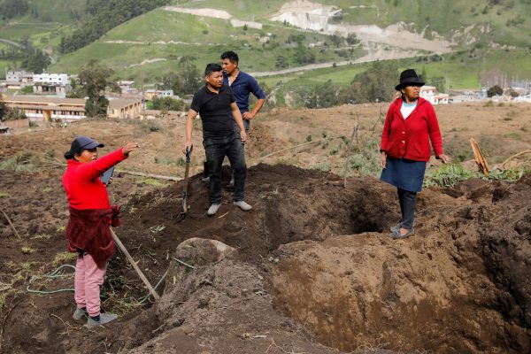 Ειδικά εκπαιδευμένα σκυλιά, σωστικά συνεργεία και κάτοικοι συνέχιζαν να ψάχνουν, με προσοχή, στα συντρίμμια· τεράστιο τμήμα ορεινού όγκου αποκολλήθηκε τη νύχτα της Κυριακής προς Δευτέρα σε αυτή την πόλη, στην επαρχία Τσιμποράσο, περίπου 300 χιλιόμετρα νότια από την πρωτεύουσα Κίτο, και καταπλάκωσε δεκάδες σπίτια.
