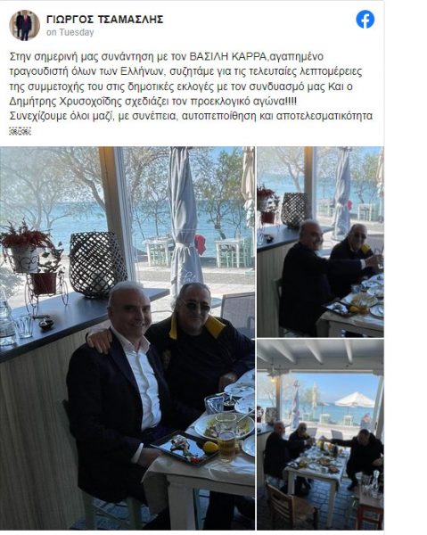«Στην σημερινή μας συνάντηση με τον ΒΑΣΙΛΗ ΚΑΡΡΑ, αγαπημένο τραγουδιστή όλων των Ελλήνων, συζητάμε για τις τελευταίες λεπτομέρειες της συμμετοχής του στις δημοτικές εκλογές με τον συνδυασμό μας Και ο Δημήτρης Χρυσοχοΐδης σχεδιάζει τον προεκλογικό αγώνα!!!! Συνεχίζουμε όλοι μαζί, με συνέπεια, αυτοπεποίθηση και αποτελεσματικότητα».