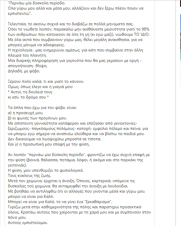 Όλα γύρω μου αλλά και μέσα μου, αλλάζουν και δεν ξέρω πλέον ποιον να εμπιστευτώ» ανέφερε στην ανάρτησή του, σημειώνοντας πως είναι κάτι που διαβάζει συχνά στα σχόλια των ακολούθων του.