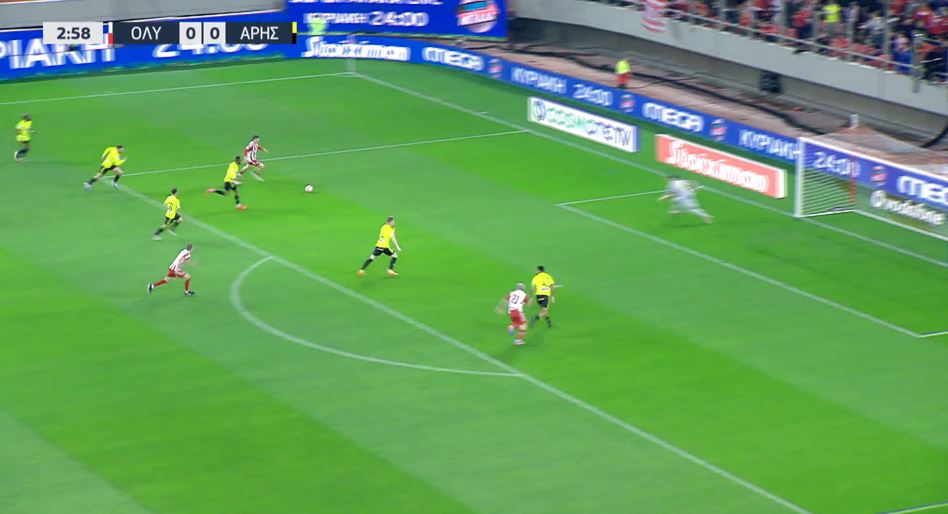 Ο Ολυμπιακός ξεκίνησε με ευκαιρία το παιχνίδι απέναντι στον Άρη, καθώς οι ερυθρόλευκοι έφτασαν κοντά στο γκολ μόλις στο τρίτο λεπτό της αναμέτρησης.
