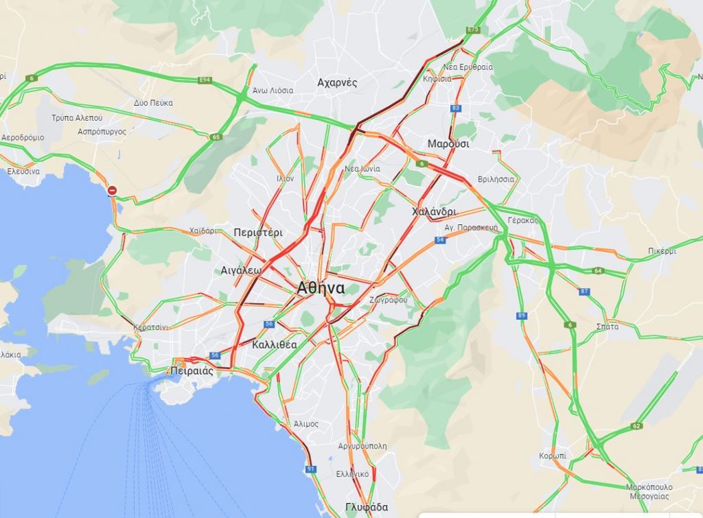 Συγκεκριμένα έντονο μποτιλιάρισμα καταγράφεται στο ρεύμα προς Πειραιά από το ύψος της Νέας Ερυθραίας μέχρι τη Νέα Φιλαδέλφεια και στο ρεύμα προς Λαμία από την Παραλιακή και ανά τμήματα μέχρι το Περιστέρι.