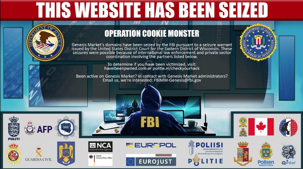 Από το βράδυ της Τρίτης, η ιστοσελίδα του Genesis Market εμφανίζει μήνυμα που αναφέρει ότι η ηλεκτρονική διεύθυνση πέρασε στον έλεγχο του FBI. Στο μήνυμα εμφανίζονται επίσης τα σήματα αστυνομικών αρχών στην Ευρώπη, τον Καναδά και την Αυστραλία, καθώς και ο λογότυπος της εταιρείας κυβερνοασφάλειας Qintel.