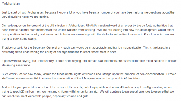 Σε απάντηση, ο Γενικός Γραμματέας Αντόνιο Γκουτέρες έγραψε στο Twitter: «Καταδικάζω έντονα την απαγόρευση στις Αφγανές συναδέλφους μας να εργαστούν στην επαρχία Νανγκαρχάρ του Αφγανιστάν. Εάν το μέτρο αυτό δεν ανατραπεί, θα υπονομεύσει αναπόφευκτα την ικανότητά μας να παρέχουμε σωτήρια βοήθεια στους ανθρώπους που την έχουν ανάγκη».