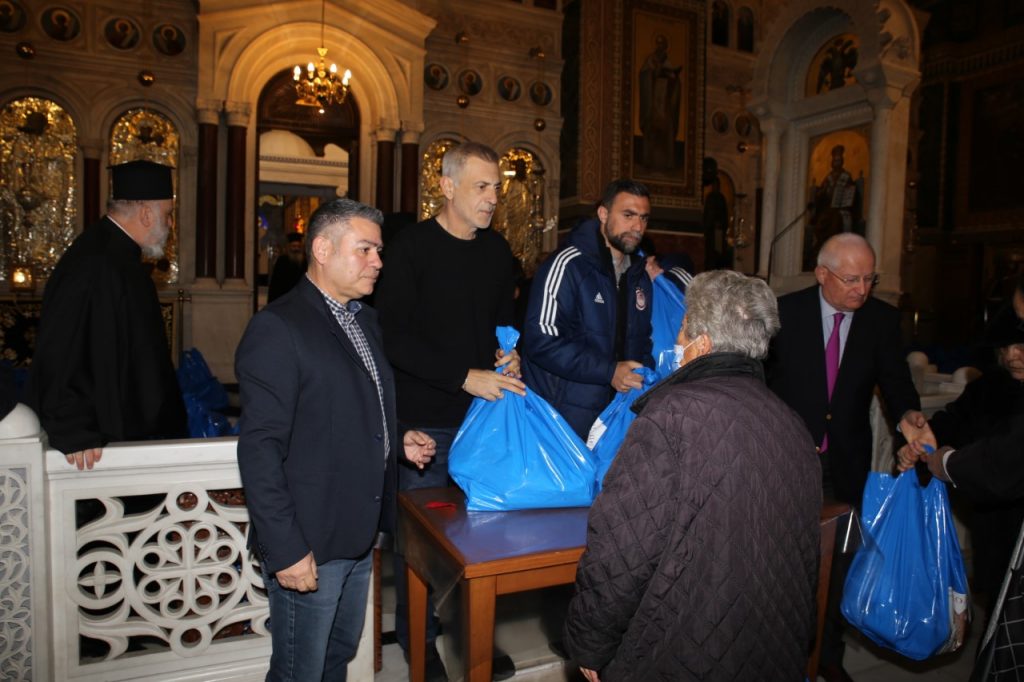Τα 7.000 δέματα αγάπης, προσφορά της ΠΑΕ Ολυμπιακός, μοίρασαν σε οικονομικά αδύναμους συνανθρώπους μας, ο μητροπολίτης Πειραιώς Σεραφείμ, ο δήμαρχος Πειραιά Γιάννης Μώραλης και ο εκπρόσωπος του προέδρου της ΠΑΕ Ολυμπιακός Βαγγέλη Μαρινάκη, διευθύνων σύμβουλος της «Καραϊσκάκης Α.Ε.» Βασίλης Βασιλειάδης.