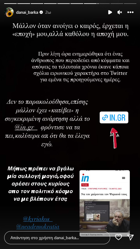 Τη δική της απάντηση στα στερεοτυπικά και στο βάθος τους ρατσιστικά σχόλια του Γρηγόρη Ψαριανού έδωσε η Δανάη Μπάρκα, μέσα από τον προσωπικό της λογαριασμό στο Instagram., επικαλούμενη και το in που έχει στηρίξει το σημαντικό κίνημα metoo από την πρώτη στιγμή, όχι μόνο στα λόγια και γιατί έτσι πρέπει, αλλά γιατί ασπάζεται τις αρχές και στηρίζει απολύτως τις διεκδικήσεις του.
