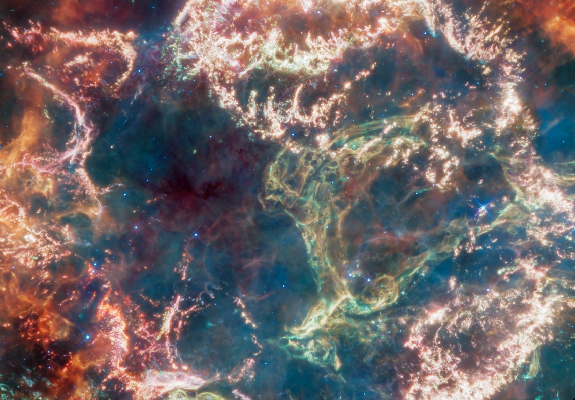 To πλάτος της εικόνας του Webb αντιστοιχεί σε περίπου δέκα έτη φωτός. Πηγή; NASA, ESA, CSA, D. D. Milisavljevic (Purdue), T. Temim (Princeton), I. De Looze (Ghent University). Image Processing: J. DePasquale (STScI).