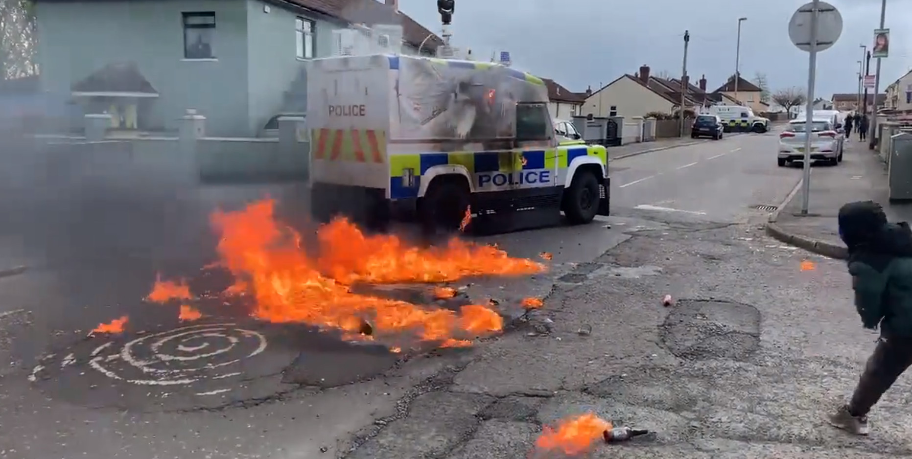 Ένας φωτορεπόρτερ του πρακτορείου Reuters είδε τέσσερις νεαρούς στην περιοχή Κρέγκαν να εκτοξεύουν βόμβες μολότοφ σε ένα όχημα της αστυνομίας, το οποίο τυλίχθηκε στις φλόγες στη μία πλευρά του.