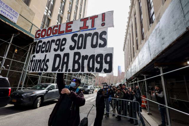 Στο δικαστικό μέγαρο του Μανχάταν όπου παρουσιάστηκε ο κ. Τραμπ για να του απαγγελθούν κατηγορίες, διαδηλωτής κράταγε πλακάτ με το σύνθημα «Γκουγκλάρετέ το! Ο Τζορτζ Σόρος χρηματοδοτεί αμερικανούς εισαγγελείς».