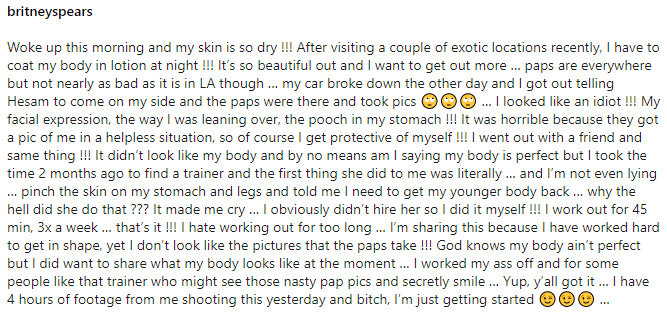 Η ίδια τόνισε: «Το μοιράζομαι γιατί έχω δουλέψει σκληρά για να είμαι σε φόρμα, αλλά δεν μοιάζω με τις φωτογραφίες που βγάζουν οι φωτογραφικές μηχανές!!! Ο Θεός ξέρει ότι το σώμα μου δεν είναι τέλειο, αλλά ήθελα να μοιραστώ το πώς είναι το σώμα μου αυτή τη στιγμή… Δούλεψα σκληρά και για κάποιους ανθρώπους όπως αυτή η γυμνάστρια που μπορεί να δει αυτές τις άσχημες φωτογραφίες των παπαράτσι και να χαμογελάσει κρυφά «Ναι, όλοι το έχετε δει. Έχω 4 ώρες βίντεο από την προπόνηση που έκανα χθες και σκ***, μόλις άρχισα».