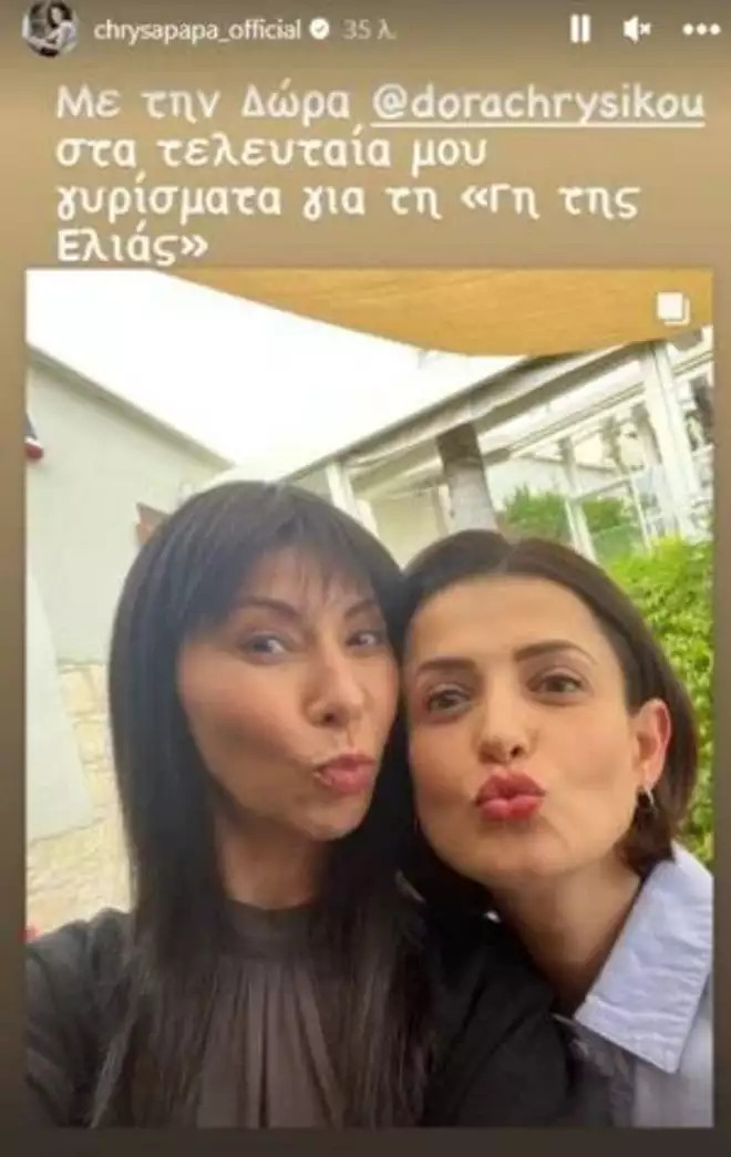 «Με την Δώρα στα τελευταία μου γυρίσματα για τη Γη της Ελιάς» έγραψε χαρακτηριστικά η Χρύσα Παππά ενημερώνοντας τους διαδικτυακούς της φίλους για το τέλος της Εύας από την καθημερινή σειρά του Μεγάλου Καναλιού.