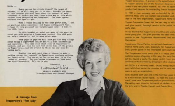 Ο Ερλ Τάπερ εφηύρε την ιδέα του δοχείου, αλλά μία έξυπνη ντίλερ και αυτοσχέδια marketeer έβαλε τη σειρά προϊόντων στα σπίτια των νοικοκυριών αψηφώντας τους κανόνες της αγοράς, δημιουργώντας νέους –τα Tupperware party ήταν πρώτα στη λίστα της κοινωνικοποίησης μεταξύ των γυναικών της δεκαετίας του ’50.