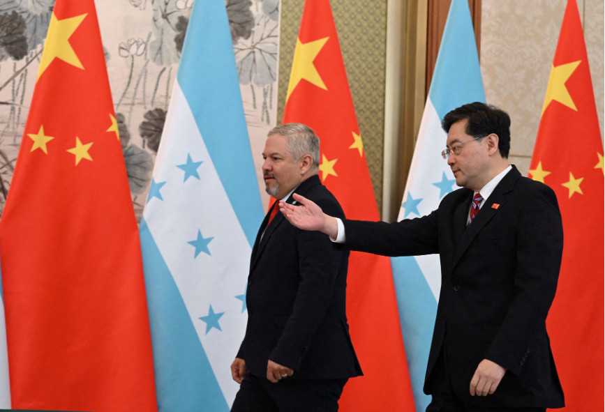 Η κινεζική αντιπροσωπεία είχε συνάντηση με υπουργική επιτροπή αποτελούμενη από τον επικεφαλής της διπλωματίας της Ονδούρας Ενρίκε Ρέινα (στη φωτογραφία αρχείου του Greg Baker via Reuters, επάνω, με τον ομόλογό του της Κίνας, Τσιν Γκανγκ), τον υπουργό Οικονομικής Ανάπτυξης Πέδρο Μπαρκέρο και την υπουργό Γεωργίας Λάουρα Σουάσο.