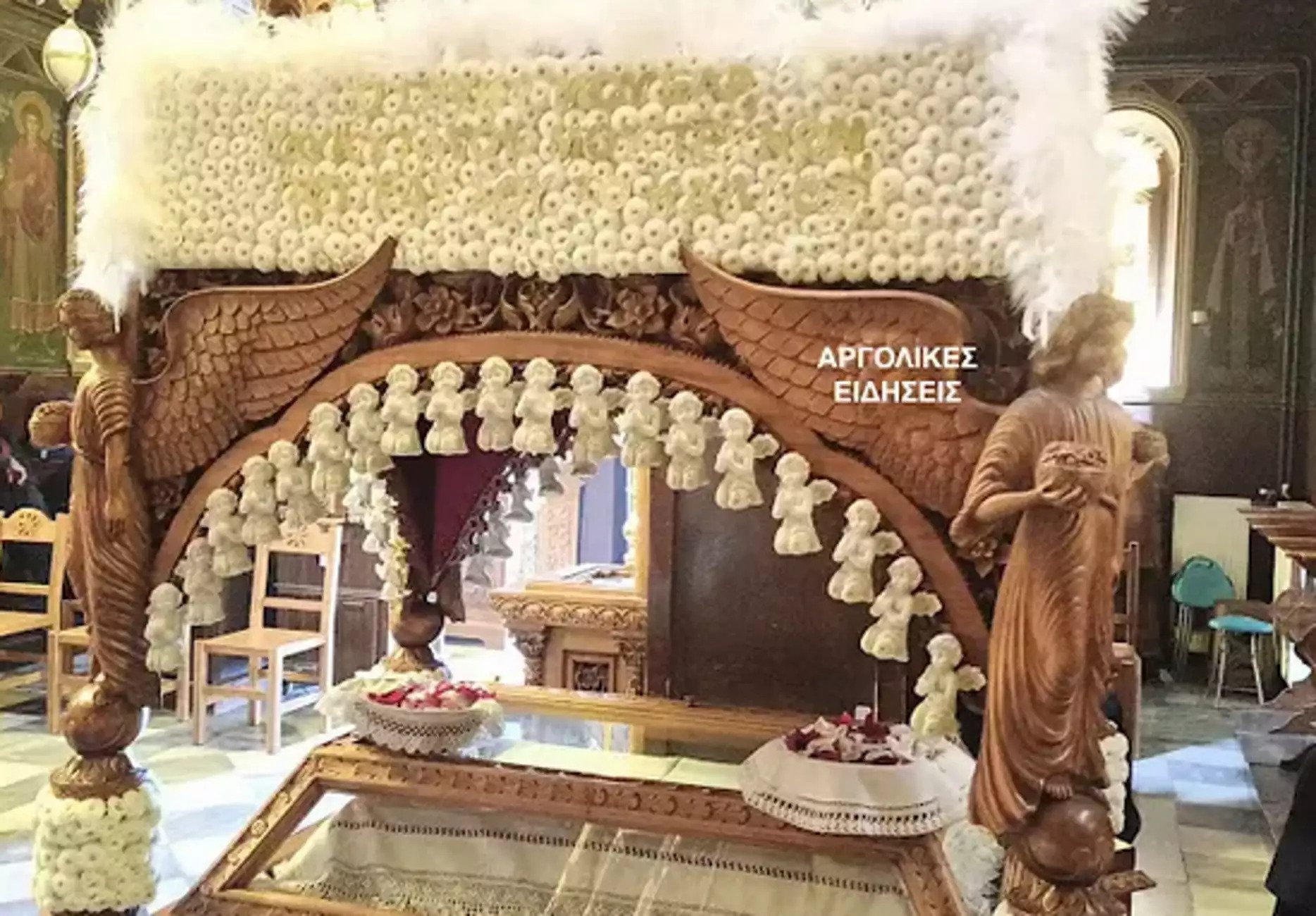 Ο Επιτάφιος στην Παναγία Φανερωμένη Χιλιομοδίου στολίστηκε με λευκά λουλούδια και 57 αγγελάκια για τα θύματα της εθνικής τραγωδίας στα Τέμπη.