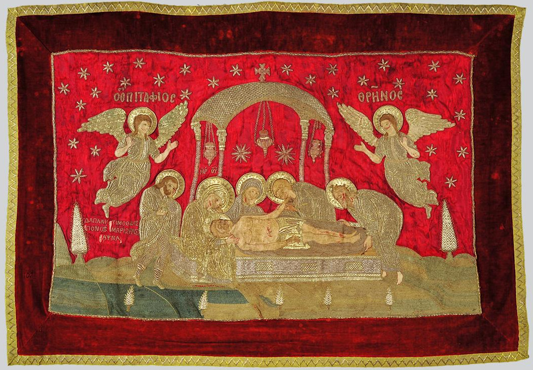 Στη φωτογραφία που συνοδεύει το κείμενο του Παλαιολόγου εικονίζεται χρυσοκέντητος επιτάφιος (λειτουργικό άμφιο), ο οποίος προέρχεται από την Κωνσταντινούπολη και χρονολογείται στο 1751 (πηγή: Βυζαντινό και Χριστιανικό Μουσείο/ebyzantinemuseum.gr).