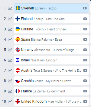 Σταθερά στη δεύτερη θέση ακολουθεί η Φινλανδία με τον εκκεντρικό Käärijä και το ξεσηκωτικό του κομμάτι με τίτλο Cha Cha Cha, που έχει ήδη προκαλέσει αίσθηση στους Eurofans. Δεν είναι λίγοι μάλιστα εκείνοι που υποστηρίζουν πως ο 29χρονος Φινλανδός ράπερ είναι ο μόνος που μπορεί να κάνει την ανατροπή και να «κλέψει» τη νίκη από τη Loreen. Η μοναδική έως τώρα νίκη της Φινλανδίας ήταν το 2006 στην Αθήνα με τους Lordi.