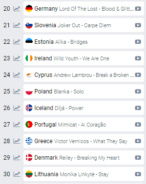 Όσον αφορά την Ελλάδα και τον Victor Vernicos με το τραγούδι What They Say, τα μέχρι στιγμής προγνωστικά μάς τοποθετούν στην 28η θέση, ενώ τέσσερις θέσεις ψηλότερα βρίσκεται η Κύπρος με τον Andrew Lambrou και το Break a Broken Heart.