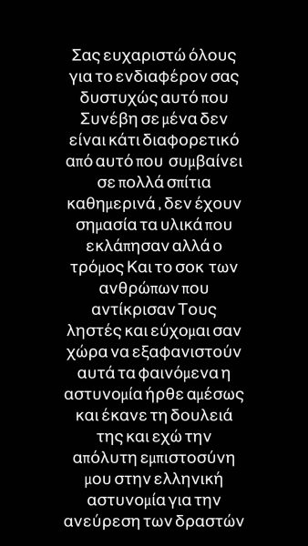 «Σας ευχαριστώ όλους για το ενδιαφέρον σας δυστυχώς αυτό που συνέβη σε μένα δεν είναι κάτι διαφορετικό από αυτό που συμβαίνει σε πολλά σπίτια καθημερινά, δεν έχουν σημασία τα υλικά που κλάπηκαν αλλά ο τρόμος και το σοκ των ανθρώπων που αντίκρισαν τους ληστές. Εύχομαι σαν χώρα να εξαφανιστούν αυτά τα φαινόμενα η αστυνομία ήρθε αμέσως και έκανε αμέσως τη δουλειά της και έχω την απόλυτη εμπιστοσύνη μου στην ελληνική αστυνομία για την ανεύρεση των δραστών» έγραψε στην ανάρτησή του.