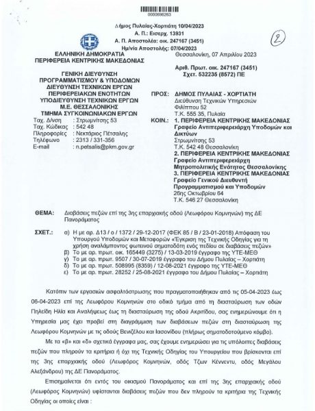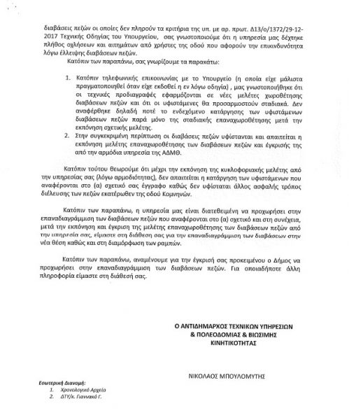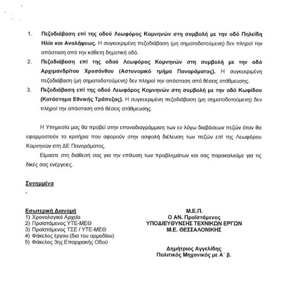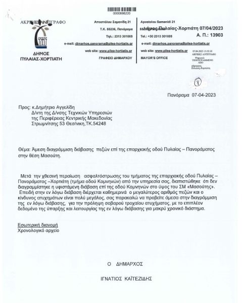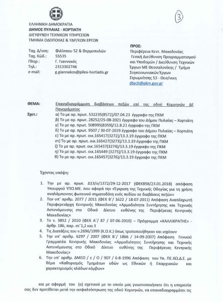 - Ο Δήμος μας επανήλθε στο θέμα με επιστολή του αρμόδιου αντιδημάρχου στις 12-04-23 (σχ.3) επισημαίνοντας εκ νέου τους σοβαρότατους κινδύνους τροχαίου ατυχήματος αλλά και την πρόθεση του Δήμου να προχωρήσει ο ίδιος με έξοδα του στην επαναδιαγράμμιση των διαβάσεων πεζών αρκεί να έχει την έγκριση της Περιφέρειας.
