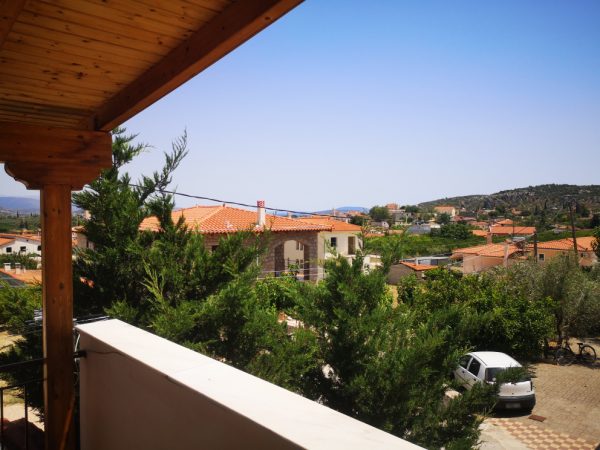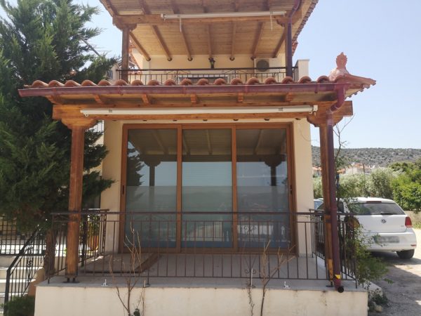 Στον ισόγειο χώρο των 39,75 τ.μ. συναντάμε την κουζίνα, το WC και έναν ενιαίο χώρο σαλοτραπεζαρίας με τζάκι, ενώ στον πρώτο όροφο βρίσκονται δυο υπνοδωμάτια και ένα μπάνιο. Το μπαλκόνι του πρώτου ορόφου διαθέτει ξύλινη πέργκολα και μεγάλο χώρο για ανάπαυλα, ενώ η μεζονέτα διαθέτει και έναν ημιυπαίθριο χώρο 15,84 τ.μ. που έχει μετατραπεί σε υπνοδωμάτιο. Από τα ευρύχωρα μπαλκόνια μπορεί κανείς να απολαύσει υπέροχη θέα προς τη θάλασσα, ενώ στο ισόγειο υπάρχει διαμορφωμένος χώρος barbeque με ψησταριά.