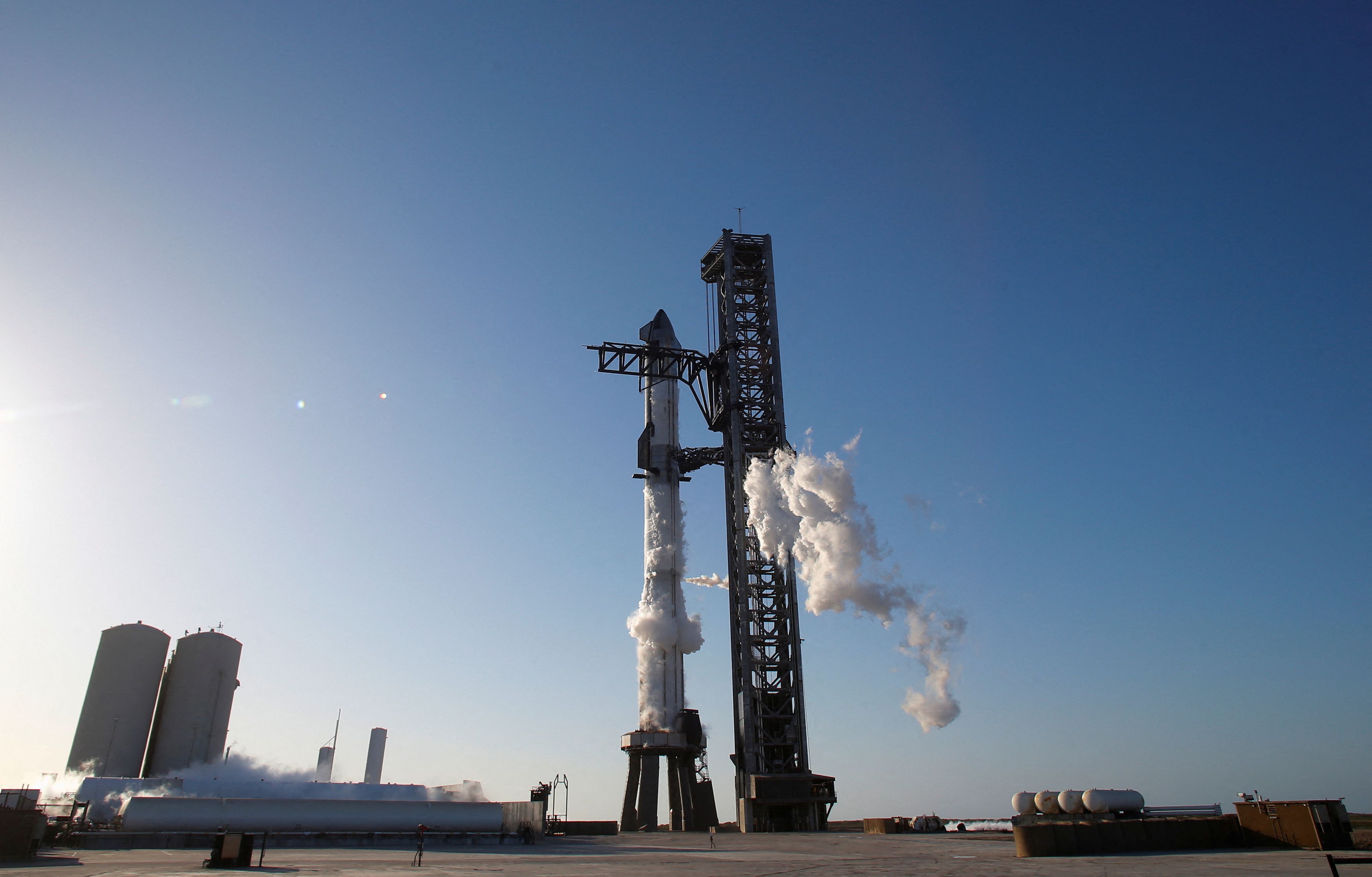 Τοποθετημένο στην κορυφή του πυραύλου Super Heavy, το σκάφος Starship περιμένει στην εξέδρα εκτόξευσης της εταιρείας στο Μπόκα Τσίκα του Τέξας, τρεις ημέρες μετά την αναβολή της πρώτης απόπειρας λόγω προβλήματος που εμφανίστηκε σε βαλβίδα.