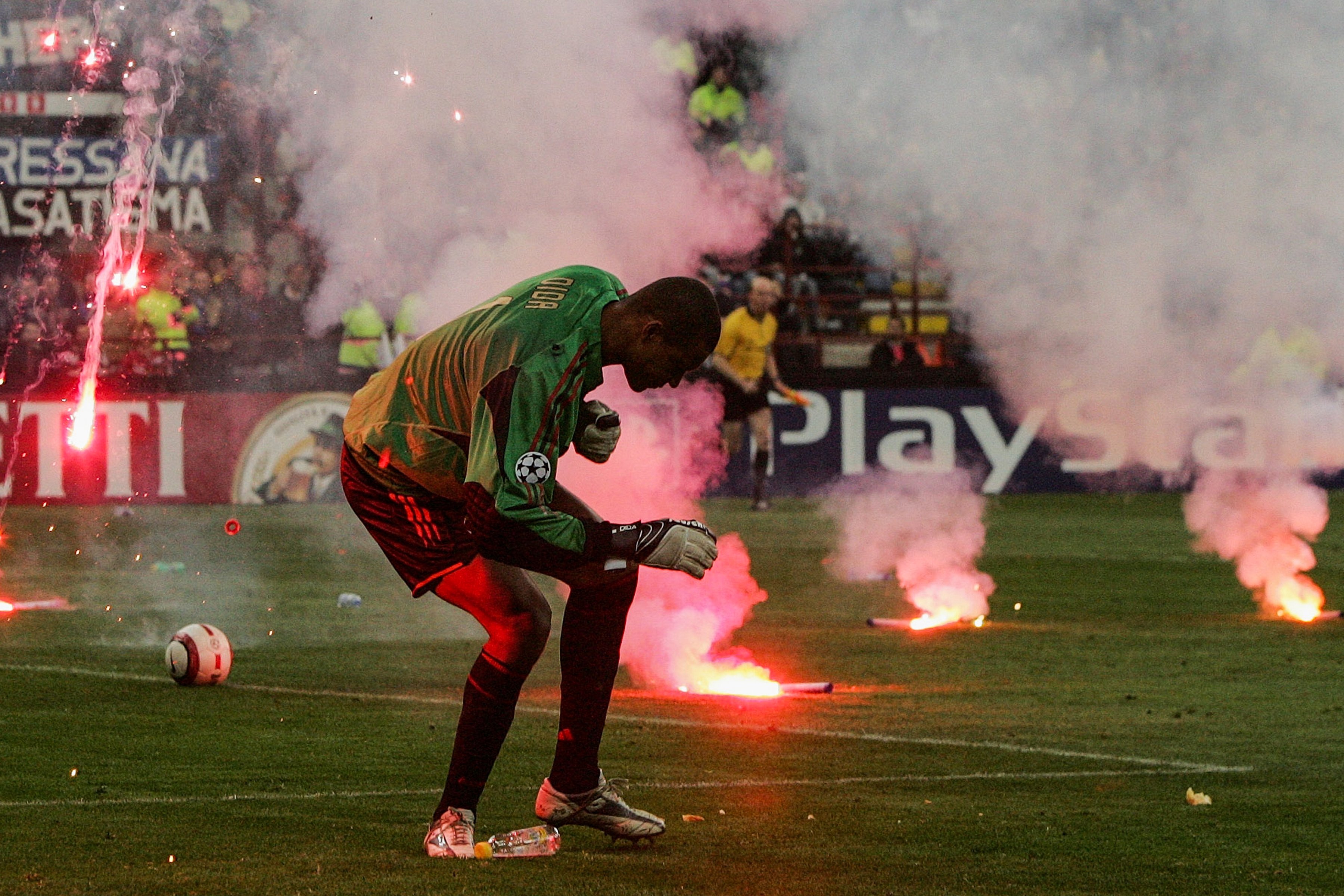 Η προσπάθειά τους θυμώνει ακόμα περισσότερους τους φανατικούς. Ο γερμανός διαιτητής Μάρκους Μερκ δίνει εντολή να αποσυρθούν οι παίκτες στα αποδυτήρια. Είκοσι πέντε λεπτά αργότερα επανέρχονται και τους υποδέχεται νέα βροχή από φωτοβολίδες. Είναι η στιγμή που ο φωτογραφικός φακός συλλαμβάνει ένα από τα πιο διάσημα ενσταντανέ του παγκόσμιου ποδοσφαίρου. Ο Μάρκο Ματεράτσι ακουμπά στον ώμο του Ρουί Κόστα και μαζί παρακολουθούν το χάος. Ο Κάρλο Αντσελότι, προπονητής τότε της Μίλαν, εκφράζει την έκπληξή του τονίζοντας πως τα θλιβερά γεγονότα δυσφημούν τόσο την Ιντερ όσο και την πόλη του Μιλάνου.