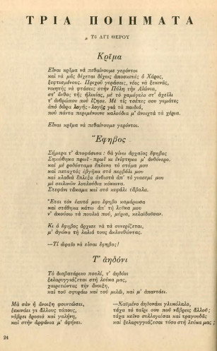 Σήμερα τ’ αποφάσισα: θα γίνω αρχαίος έφηβος Σηκώθηκα πρωί-πρωί κι ενίφτηκα μ’ ανθόνερο και με ροδόσταμο έπλυνα το στόμα μου και πεταχτός εβγήκα στο περβόλι μου και κλαδιά έπλεξα ανθιστά απ’ το γιασεμί μου με σειλινών λουλούδια κόκκινα. Στεφάνι τάκαμα και στο κεφάλι τάβαλα.
