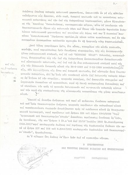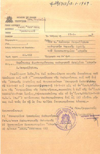 «Η δικτατορία προχώρησε σε μια σειρά από απολύσεις μελών του διδακτικού προσωπικού που κρίθηκαν ως μη νομιμόφρονες. Το πρώτο κύμα απομακρύνσεων πραγματοποιήθηκε τον Ιανουάριο του 1968 όταν δέκα καθηγητές και υφηγητές του ΕΚΠΑ έχασαν τη θέση τους μαζί με ακόμα 46 συναδέλφους τους από τα άλλα πανεπιστημιακά ιδρύματα της χώρας.