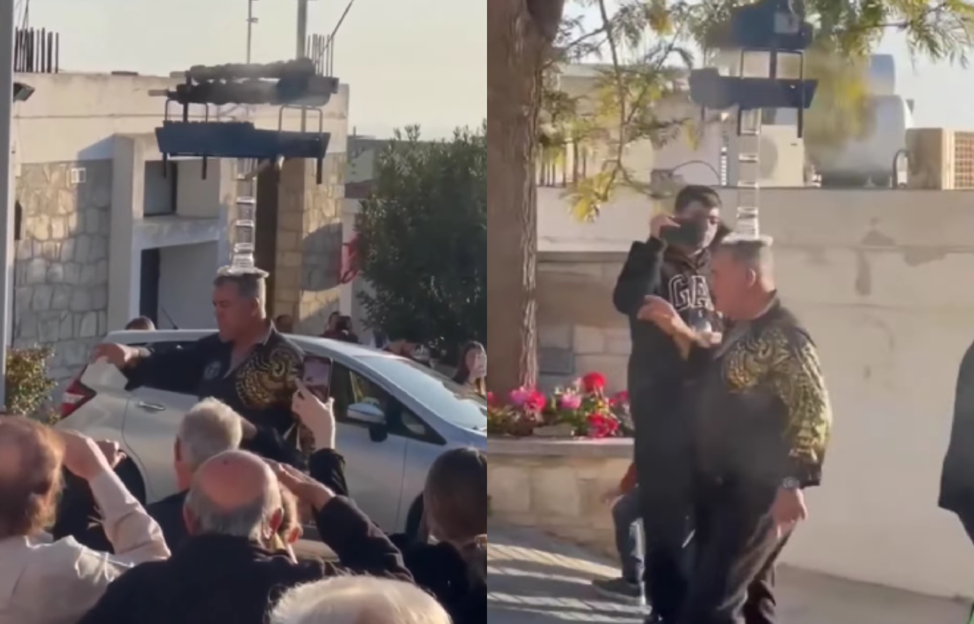 Ο κύριος όχι μόνο χόρεψε τον παραδοσιακό κυπριακό χορό, έχοντας στο κεφάλι του τα ποτήρια αλλά το πήγε σε άλλο επίπεδο, στερεώνοντας και την αναμμένη ψησταριά με τη σούβλα.