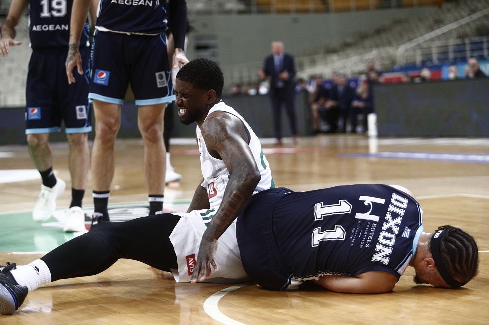 Στο 7ο λεπτό της πρώτης περιόδου ο Αμερικανός του τριφυλλιού γλίστρησε και συγκρούστηκε άσχημα με τον Ντίξον του Κολοσσού με αποτέλεσμα να βρεθούν και οι δύο στο παρκέ.