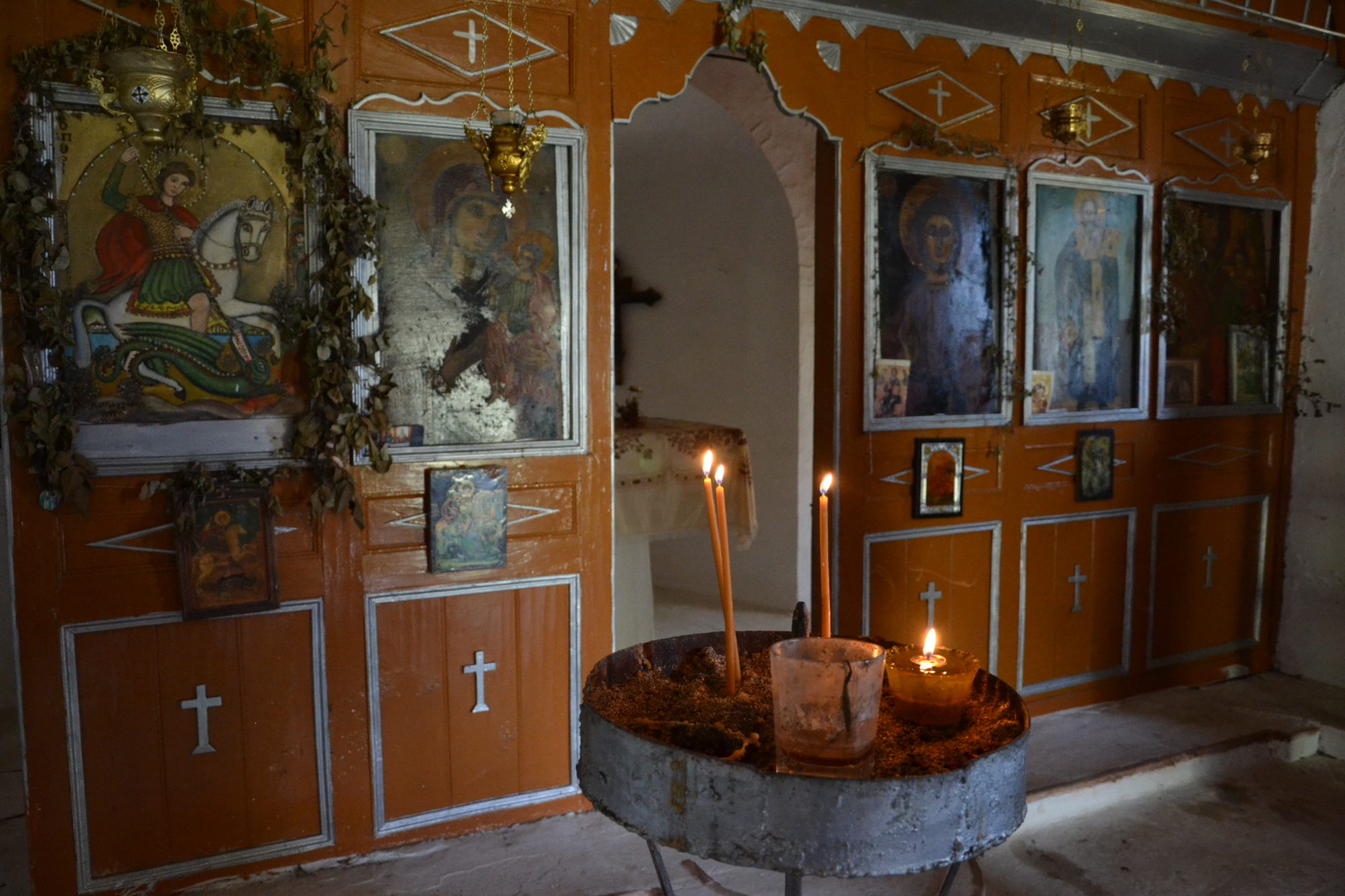 Με λίγες δάφνες στολισμένο το εικόνισμα του Άη Γιώργη, προσέχεις πως οι προσκυνητές -όσοι φτάνουν εδώ- θαρρείς κι αποφεύγουν να ασπαστούν την εικόνα. «Τι φοβούνται, μη κολλήσουν μια χαμένη αρρώστια;» ρωτάς τον οδηγό σου. «Είναι πολύ βαριά η μνήμη τούτου του χώρου. Με πολλές ιστορίες και ζωντανές ακόμα τις μαρτυρίες για αυτόν σαν τόπος συνώνυμος της κόλασης» σου απαντά.