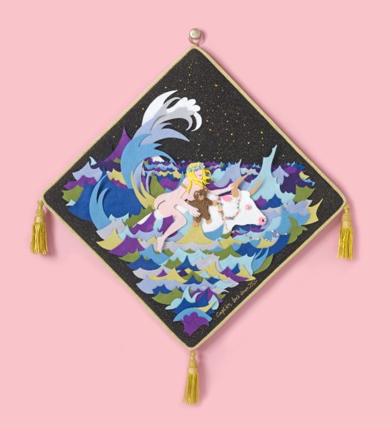 Η Αρπαγή της Ευρώπης, 65×65 (cm), 2020, μεικτή τεχνική (χρωματιστές τσόχες-fetrin σε βελούδο) / Photo: Χριστόφορος Δουλγέρης