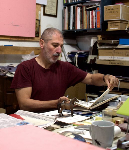 Λοιπόν, και στην προηγούμενη έκθεση, το θέμα μου ήταν βιωματικό, εκφρασμένο με διαφορετικό τρόπο. Εκεί το θέμα ήταν η επιβίωση, τώρα, η επιβίωση με τη σύντροφό μου σε συνθήκες εγκλεισμού. Η ιστορία άλλωστε με τις κατσαρίδες ξεκίνησε από τα πολεμικά πλοία του ναυτικού, που κάποτε υπηρέτησα ως αξιωματικός και ήταν γεμάτα από δαύτες, μέχρι που τελικά τις αποθεώνω με μεγαλείο ιερατικό σε μία άλλου τύπου «μεταμόρφωση», απ’ ότι στον Κάφκα, όπου ο Γκρέκορ Σάμσα μεταμορφώνεται σε ένα απεχθές ζωύφιο απέναντι στη δυσανεξία του σε μια κοινωνία που τελικά τον σκοτώνει.