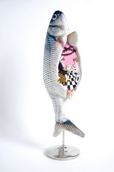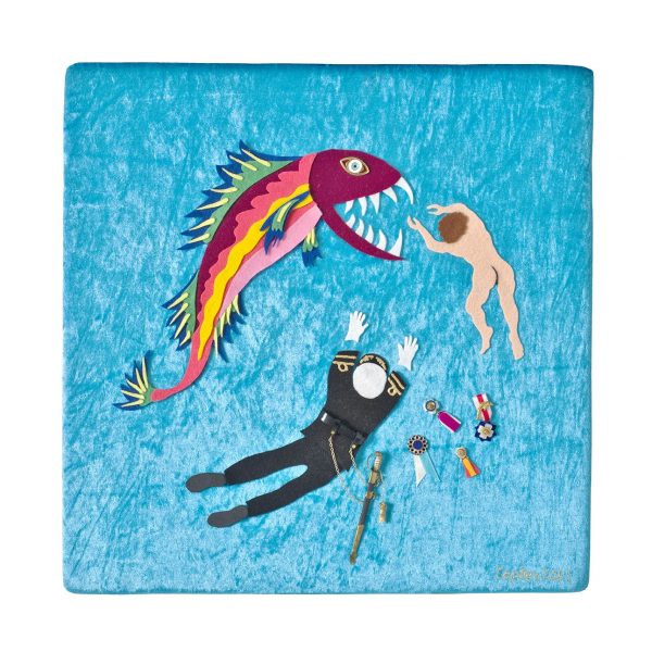 Και όμως υπάρχει Θεός!, 33x9x13 (cm), 2021, μεικτή τεχνική (ψάρι ready made,χρωματιστές τσόχες-fetrin) / Photo: Χριστόφορος Δουλγέρης