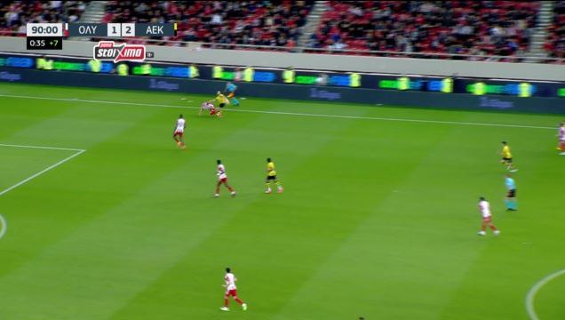 Ο Μαροκινός εξτρέμ της ΑΕΚ έσπρωξε τον αμυντικό των πειραιωτών, αλλά ο Ιταλός ρέφερι δεν έδωσε το πεντακάθαρο φάουλ και στην εξέλιξη της φάσης, ο Μάνταλος έστειλε την μπάλα στα δίχτυα.