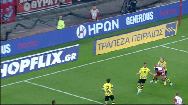 Ο Κροάτης στόπερ της Ένωσης σπρώχνει τον σέντερ φορ του Ολυμπιακού εντός περιοχής, αλλά ο ρέφερι δεν καταλόγισε την παράβαση και άφησε να συνεχιστεί το παιχνίδι.